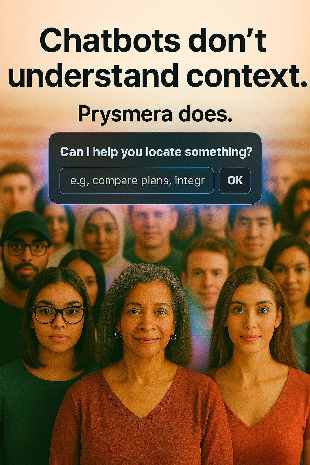 Shows visitors exactly what they need without them asking. Prysmera AI learns through complex patent pending pattern recognition, not cookies.